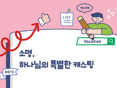 ‘소명’이란 말을 들으면 특별하고 거창한 일을 해야 할 것만 같아 부담스럽게 느껴질 수 있어요. 하지만 소명은 친구들이 발을 딛고 있는 지금 이곳에 있어요. 우리가 서 있는 자리에서 내 모습 그대로 하나님과 동행하는 것이 소명의 핵심이에요.